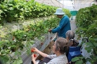 ハウス内は広く、いちご棚が低く作られており車椅子の方でも食べられるようにされています。